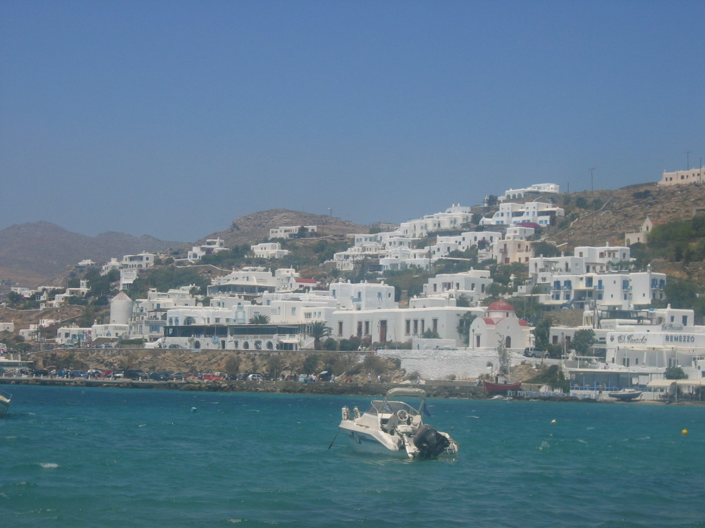 We met a honeymooning couple from Los Angeles on the boat and chatted with them til the boat pulled into a port. We usually are last to board any transport and the last to get off – what is the rush? So this couple dashed off to get their luggage while we sat to look out at the island. Hmmm… strange! We always thought Mykonos had white houses along the coastline – totally thought we were duped with touristy brochures, because the houses we saw were definitely NOT white.